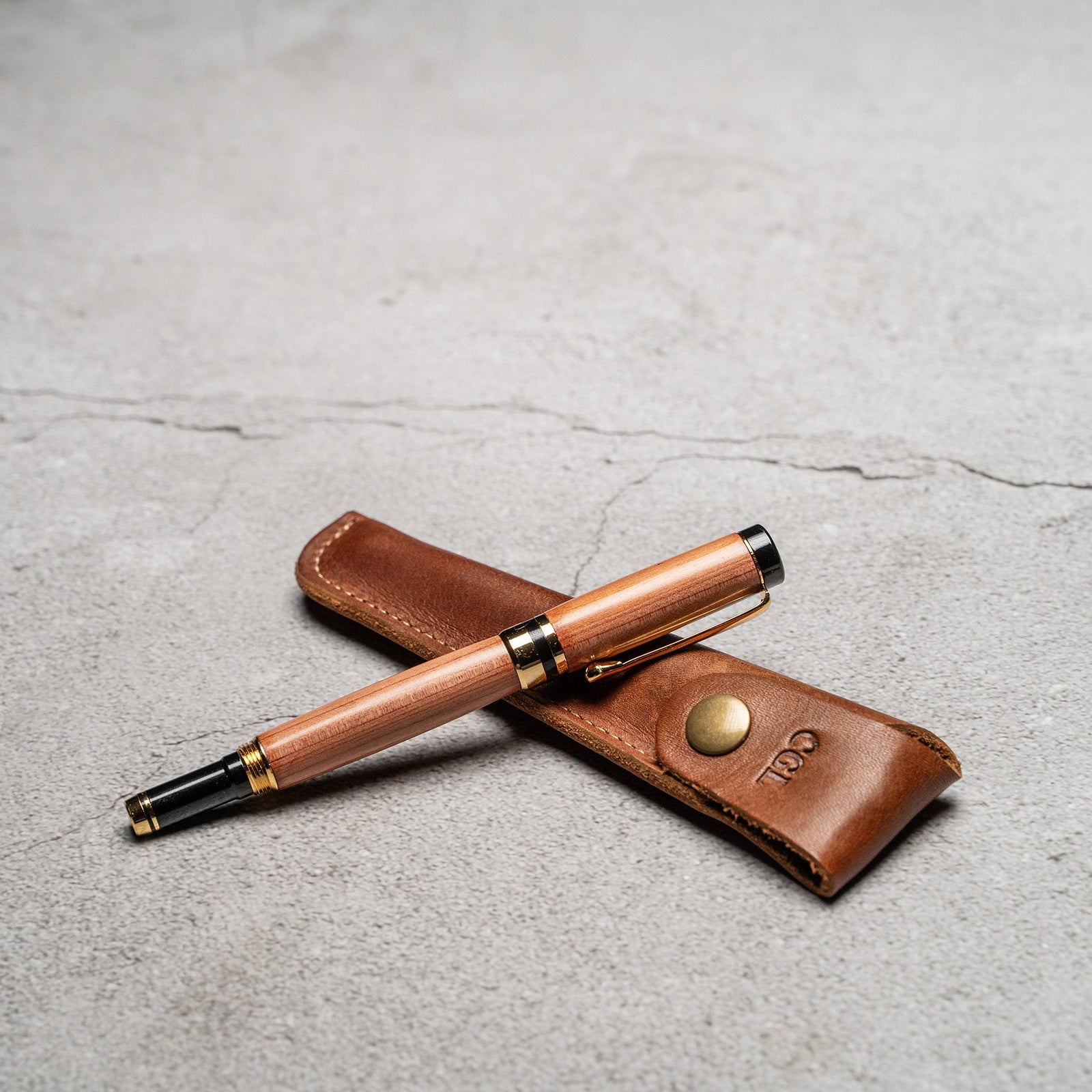 Hand-Turned American Chestnut Rollerball Pen + Fine Leather Pen Sleeve