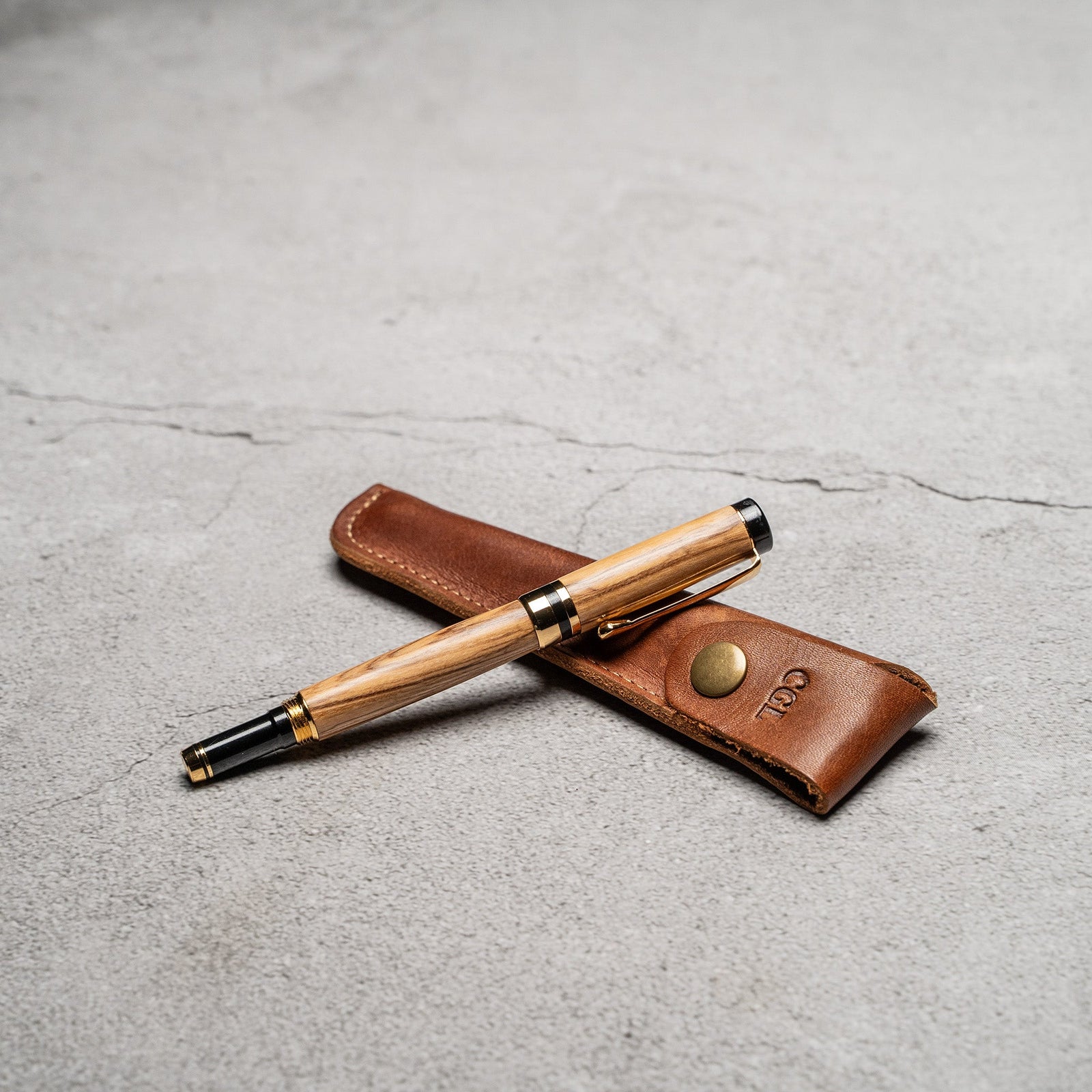 Hand-Turned Olive Wood Rollerball Pen + Fine Leather Pen Sleeve